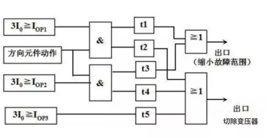 如圖所示,零序方向電流保護(hù)I段或II段動作后,首先通過短延時t1或t3跳母聯(lián)或跳本側(cè)開關(guān),以縮小故障影響范圍,如果故障量仍然存在,則通過長延時t2或t4跳三側(cè)開關(guān)切除變壓器。無方向的III段,通過延遲直接切除變壓器。